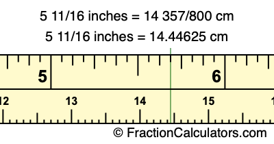 One inch is equal to 127/50 centimeters. Therefore, to get the fractional answer to 5 11/16 inches to cm, we multiply 5 11/16 inches by 127/50 and simplify if necessary.