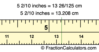 One inch is equal to 127/50 centimeters. Therefore, to get the fractional answer to 5 2/10 inches to cm, we multiply 5 2/10 inches by 127/50 and simplify if necessary.
