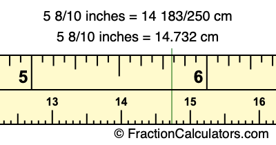 Centimeters is usually given in decimal form, so we have also converted the fractional answer to 5 8/10 inches to cm, to decimal form: