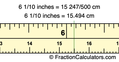 One inch is equal to 127/50 centimeters. Therefore, to get the fractional answer to 6 1/10 inches to cm, we multiply 6 1/10 inches by 127/50 and simplify if necessary.