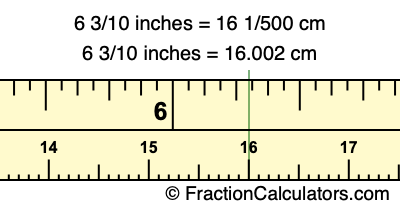Centimeters is usually given in decimal form, so we have also converted the fractional answer to 6 3/10 inches to cm, to decimal form:
