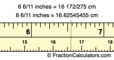 One inch is equal to 127/50 centimeters. Therefore, to get the fractional answer to 6 6/11 inches to cm, we multiply 6 6/11 inches by 127/50 and simplify if necessary.