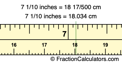 Centimeters is usually given in decimal form, so we have also converted the fractional answer to 7 1/10 inches to cm, to decimal form: