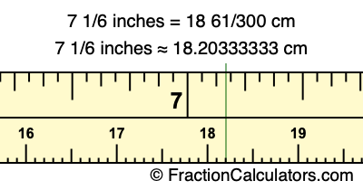 One inch is equal to 127/50 centimeters. Therefore, to get the fractional answer to 7 1/6 inches to cm, we multiply 7 1/6 inches by 127/50 and simplify if necessary.