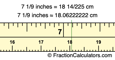 One inch is equal to 127/50 centimeters. Therefore, to get the fractional answer to 7 1/9 inches to cm, we multiply 7 1/9 inches by 127/50 and simplify if necessary.