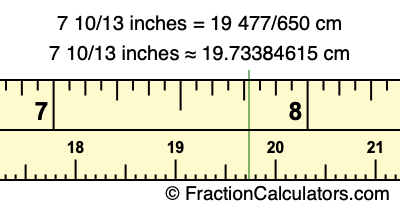 Centimeters is usually given in decimal form, so we have also converted the fractional answer to 7 10/13 inches to cm, to decimal form: