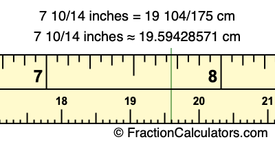 Centimeters is usually given in decimal form, so we have also converted the fractional answer to 7 10/14 inches to cm, to decimal form: