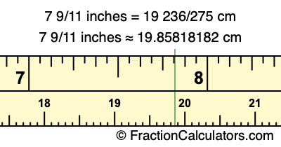 Centimeters is usually given in decimal form, so we have also converted the fractional answer to 7 9/11 inches to cm, to decimal form:
