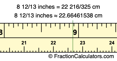 Centimeters is usually given in decimal form, so we have also converted the fractional answer to 8 12/13 inches to cm, to decimal form: