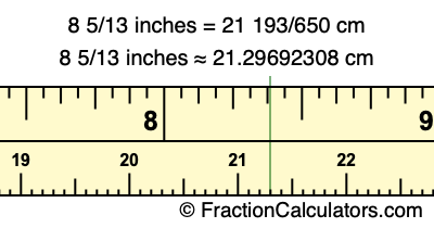 Centimeters is usually given in decimal form, so we have also converted the fractional answer to 8 5/13 inches to cm, to decimal form: