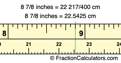 Centimeters is usually given in decimal form, so we have also converted the fractional answer to 8 7/8 inches to cm, to decimal form: