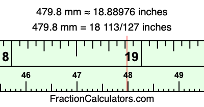 One millimeter is equal to 5/127 inches, and 479.8 as a fraction is 2399/5. Therefore, to get the fractional answer to 479.8 mm in inches, we multiply 2399/5 by 5/127 and simplify if necessary.