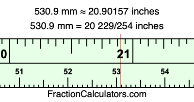 One millimeter is equal to 5/127 inches, and 530.9 as a fraction is 5309/10. Therefore, to get the fractional answer to 530.9 mm in inches, we multiply 5309/10 by 5/127 and simplify if necessary.