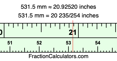 One millimeter is equal to 5/127 inches, and 531.5 as a fraction is 1063/2. Therefore, to get the fractional answer to 531.5 mm in inches, we multiply 1063/2 by 5/127 and simplify if necessary.