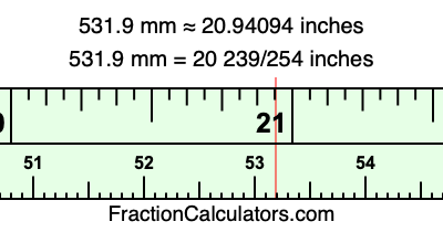 One millimeter is equal to 5/127 inches, and 531.9 as a fraction is 5319/10. Therefore, to get the fractional answer to 531.9 mm in inches, we multiply 5319/10 by 5/127 and simplify if necessary.