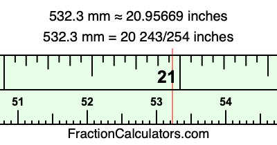 One millimeter is equal to 5/127 inches, and 532.3 as a fraction is 5323/10. Therefore, to get the fractional answer to 532.3 mm in inches, we multiply 5323/10 by 5/127 and simplify if necessary.