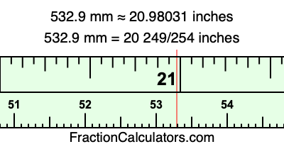 One millimeter is equal to 5/127 inches, and 532.9 as a fraction is 5329/10. Therefore, to get the fractional answer to 532.9 mm in inches, we multiply 5329/10 by 5/127 and simplify if necessary.