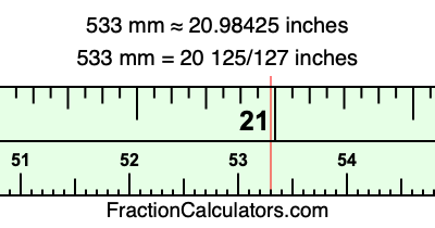 One millimeter is equal to 5/127 inches, and 533 as a fraction is 533/1. Therefore, to get the fractional answer to 533 mm in inches, we multiply 533/1 by 5/127 and simplify if necessary.