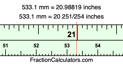 One millimeter is equal to 5/127 inches, and 533.1 as a fraction is 5331/10. Therefore, to get the fractional answer to 533.1 mm in inches, we multiply 5331/10 by 5/127 and simplify if necessary.