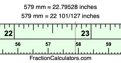 One millimeter is equal to 5/127 inches, and 579 as a fraction is 579/1. Therefore, to get the fractional answer to 579 mm in inches, we multiply 579/1 by 5/127 and simplify if necessary.