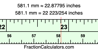 One millimeter is equal to 5/127 inches, and 581.1 as a fraction is 5811/10. Therefore, to get the fractional answer to 581.1 mm in inches, we multiply 5811/10 by 5/127 and simplify if necessary.