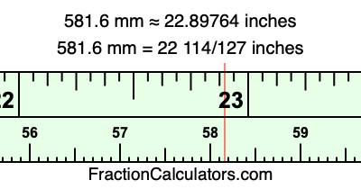 One millimeter is equal to 5/127 inches, and 581.6 as a fraction is 2908/5. Therefore, to get the fractional answer to 581.6 mm in inches, we multiply 2908/5 by 5/127 and simplify if necessary.