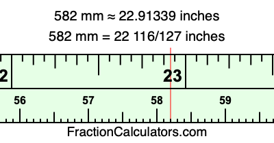 One millimeter is equal to 5/127 inches, and 582 as a fraction is 582/1. Therefore, to get the fractional answer to 582 mm in inches, we multiply 582/1 by 5/127 and simplify if necessary.