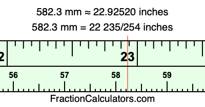 One millimeter is equal to 5/127 inches, and 582.3 as a fraction is 5823/10. Therefore, to get the fractional answer to 582.3 mm in inches, we multiply 5823/10 by 5/127 and simplify if necessary.
