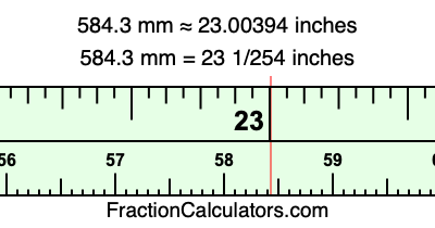 One millimeter is equal to 5/127 inches, and 584.3 as a fraction is 5843/10. Therefore, to get the fractional answer to 584.3 mm in inches, we multiply 5843/10 by 5/127 and simplify if necessary.
