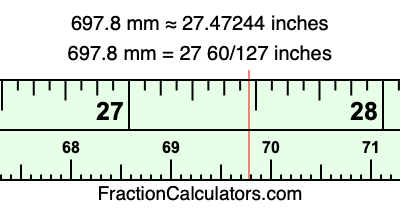One millimeter is equal to 5/127 inches, and 697.8 as a fraction is 3489/5. Therefore, to get the fractional answer to 697.8 mm in inches, we multiply 3489/5 by 5/127 and simplify if necessary.