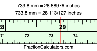 One millimeter is equal to 5/127 inches, and 733.8 as a fraction is 3669/5. Therefore, to get the fractional answer to 733.8 mm in inches, we multiply 3669/5 by 5/127 and simplify if necessary.