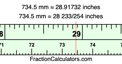 One millimeter is equal to 5/127 inches, and 734.5 as a fraction is 1469/2. Therefore, to get the fractional answer to 734.5 mm in inches, we multiply 1469/2 by 5/127 and simplify if necessary.