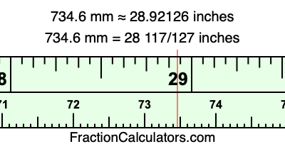 One millimeter is equal to 5/127 inches, and 734.6 as a fraction is 3673/5. Therefore, to get the fractional answer to 734.6 mm in inches, we multiply 3673/5 by 5/127 and simplify if necessary.