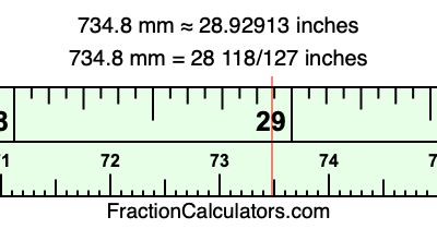 One millimeter is equal to 5/127 inches, and 734.8 as a fraction is 3674/5. Therefore, to get the fractional answer to 734.8 mm in inches, we multiply 3674/5 by 5/127 and simplify if necessary.