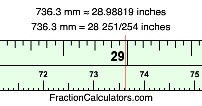 One millimeter is equal to 5/127 inches, and 736.3 as a fraction is 7363/10. Therefore, to get the fractional answer to 736.3 mm in inches, we multiply 7363/10 by 5/127 and simplify if necessary.