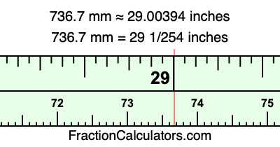 One millimeter is equal to 5/127 inches, and 736.7 as a fraction is 7367/10. Therefore, to get the fractional answer to 736.7 mm in inches, we multiply 7367/10 by 5/127 and simplify if necessary.
