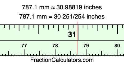 One millimeter is equal to 5/127 inches, and 787.1 as a fraction is 7871/10. Therefore, to get the fractional answer to 787.1 mm in inches, we multiply 7871/10 by 5/127 and simplify if necessary.