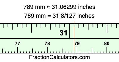 One millimeter is equal to 5/127 inches, and 789 as a fraction is 789/1. Therefore, to get the fractional answer to 789 mm in inches, we multiply 789/1 by 5/127 and simplify if necessary.