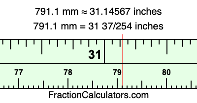 One millimeter is equal to 5/127 inches, and 791.1 as a fraction is 7911/10. Therefore, to get the fractional answer to 791.1 mm in inches, we multiply 7911/10 by 5/127 and simplify if necessary.