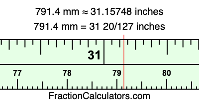 One millimeter is equal to 5/127 inches, and 791.4 as a fraction is 3957/5. Therefore, to get the fractional answer to 791.4 mm in inches, we multiply 3957/5 by 5/127 and simplify if necessary.