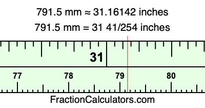 One millimeter is equal to 5/127 inches, and 791.5 as a fraction is 1583/2. Therefore, to get the fractional answer to 791.5 mm in inches, we multiply 1583/2 by 5/127 and simplify if necessary.