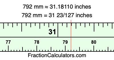One millimeter is equal to 5/127 inches, and 792 as a fraction is 792/1. Therefore, to get the fractional answer to 792 mm in inches, we multiply 792/1 by 5/127 and simplify if necessary.
