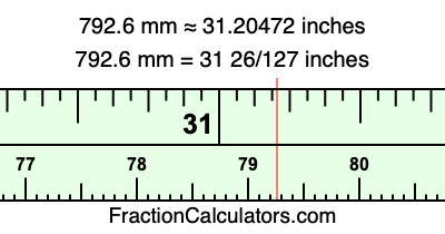 One millimeter is equal to 5/127 inches, and 792.6 as a fraction is 3963/5. Therefore, to get the fractional answer to 792.6 mm in inches, we multiply 3963/5 by 5/127 and simplify if necessary.