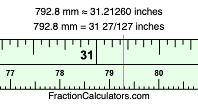 One millimeter is equal to 5/127 inches, and 792.8 as a fraction is 3964/5. Therefore, to get the fractional answer to 792.8 mm in inches, we multiply 3964/5 by 5/127 and simplify if necessary.