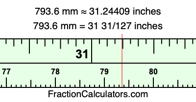 One millimeter is equal to 5/127 inches, and 793.6 as a fraction is 3968/5. Therefore, to get the fractional answer to 793.6 mm in inches, we multiply 3968/5 by 5/127 and simplify if necessary.