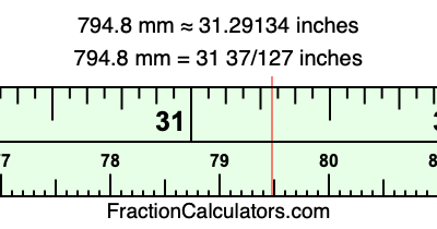 One millimeter is equal to 5/127 inches, and 794.8 as a fraction is 3974/5. Therefore, to get the fractional answer to 794.8 mm in inches, we multiply 3974/5 by 5/127 and simplify if necessary.