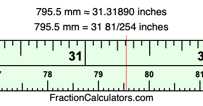 One millimeter is equal to 5/127 inches, and 795.5 as a fraction is 1591/2. Therefore, to get the fractional answer to 795.5 mm in inches, we multiply 1591/2 by 5/127 and simplify if necessary.
