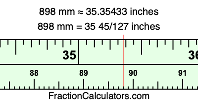 One millimeter is equal to 5/127 inches, and 898 as a fraction is 898/1. Therefore, to get the fractional answer to 898 mm in inches, we multiply 898/1 by 5/127 and simplify if necessary.