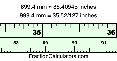 One millimeter is equal to 5/127 inches, and 899.4 as a fraction is 4497/5. Therefore, to get the fractional answer to 899.4 mm in inches, we multiply 4497/5 by 5/127 and simplify if necessary.