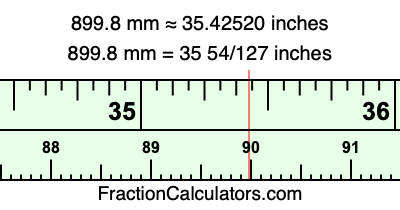 One millimeter is equal to 5/127 inches, and 899.8 as a fraction is 4499/5. Therefore, to get the fractional answer to 899.8 mm in inches, we multiply 4499/5 by 5/127 and simplify if necessary.